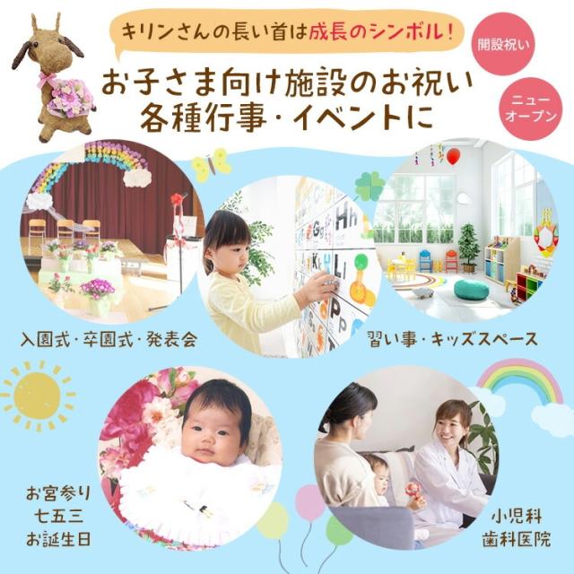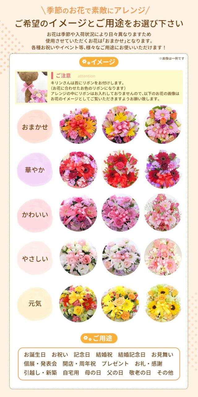 長い首がチャームポイント!みんな大好きキリンさんに季節のお花を素敵にアレンジ 致します♪お花はあなたの心からの思いやりや感謝の気持ちを美しく表現し、きっと幸せで満たしてくれるはず。季節のお花で華やかに彩る生花アレンジメントは花材指定がないため、入荷状況に応じて適切なお花を使用することで価格を抑え、ギリギリの価格にて販売させていただいております。花瓶の心配がある花束よりも花瓶の必要がない生花アレンジメント(かごに活けたお花)が贈りやすく人気!