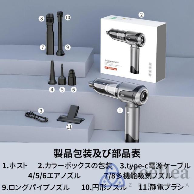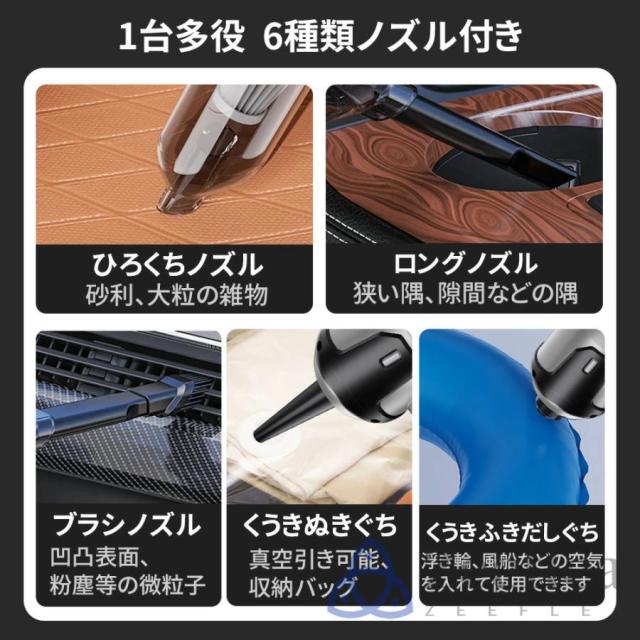 車載用掃除機が吸引と吹き出しの両方の機能を備えており、さらに6種類の吸引ノズルと吹き出しノズルが付属してます。ユーザーは、清掃の目的や要件に応じて各ノズルを選択して使用できます。これにより、車内のゴミやほこりの吸引だけでなく、エアコンや細かい箇所の吹き出しにも効果的に対応できます。ユーザーは必要に応じてノズルを組み合わせることで、より幅広い清掃ニーズに対応することができます。