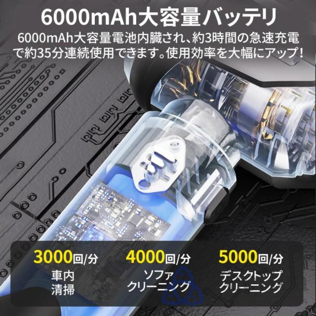 コードレスカー掃除機は、強力な6000mAhの充電式バッテリーを搭載しており、便利なUSB充電に対応しています。