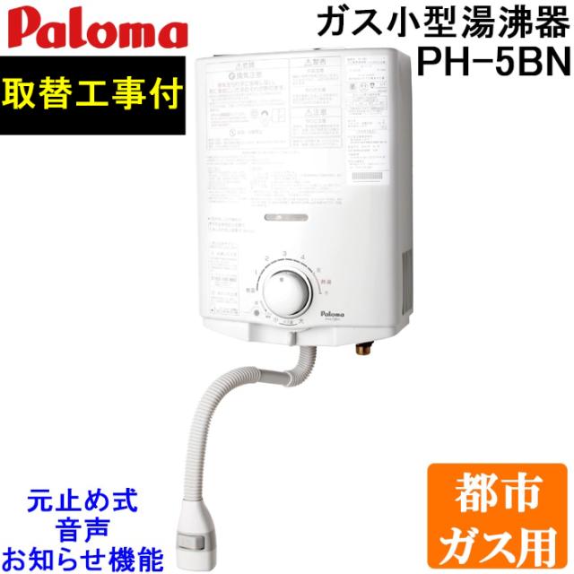 パロマ PH-5BN-13A 取替工事付き ガス小型湯沸器 元止め式 都市ガス用 5号 一般地用 設置 取付 処分 施工 回収 交換 日本製 音声おしらせ機能付 ガス瞬間湯沸器 屋内壁掛 (PH-5BVの後継品) Paloma (代引不可)
