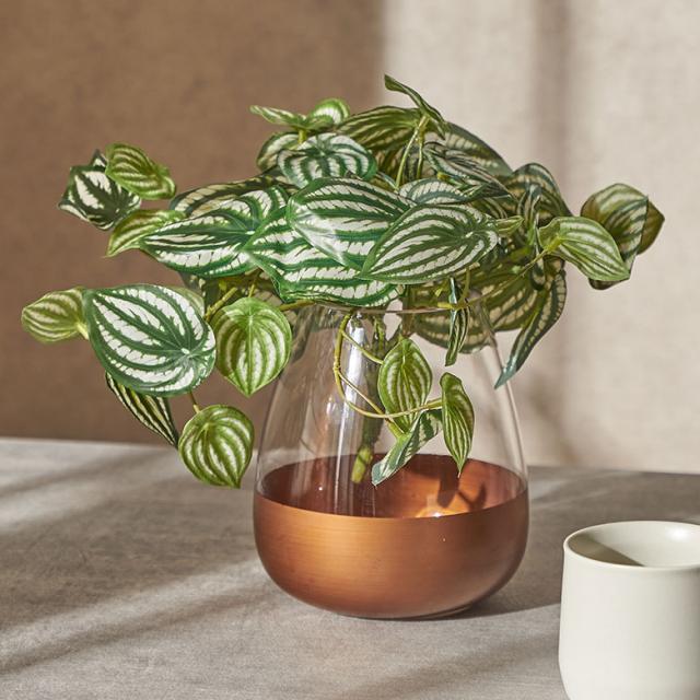 銀白色の縞模様の葉が魅力のフェイクグリーン、ペペロミア バイン。スイカ柄の模様から「スイカペペ」という愛称で知られるペペロミア・アルギレイをリアルに再現しました。縞模様の葉が優雅に垂れ下がる姿は、ハンギングディスプレイやエレガントなアレンジメントのアクセントとして最適です。水やり不要で枯れる心配もなく、風通しや日当たりを考慮する必要もないため、どんな場所にも気軽に取り入れられるのが魅力。