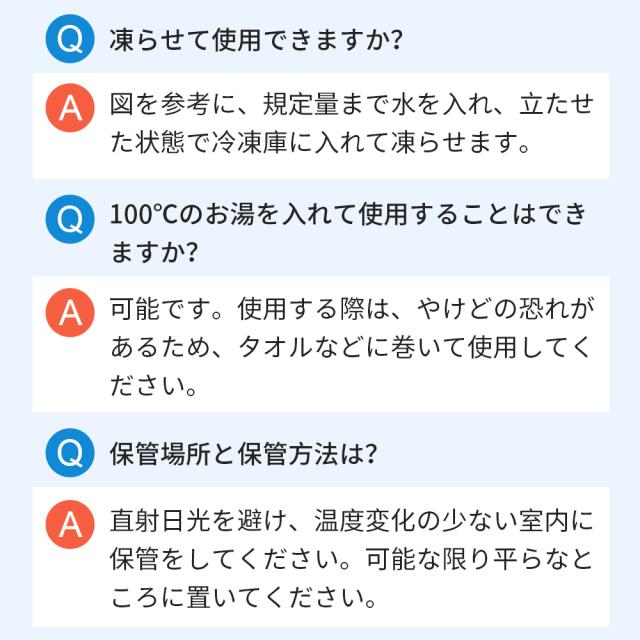 - 朝冷凍庫から出してケースに入れ、夜になっても氷が少し残っている。(ほぼケースに入れたままの状態) 実際は使い方しだいで、冷たく使える時間は大きく変わると思われる。 夏は氷嚢、冬は湯湯婆として使えるのは良いですね。 まだ炎天下で使っていないのと、耐久性が未定な為★4とします。