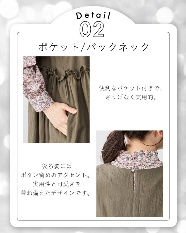 | 商品詳細/その他 | トリプルウォッシュ加工を施したコットン素材のワンピース。天日干しで引き出された柔らかさと、ギャザーで生まれるふんわりフォルムが可愛らしさを演出。 |