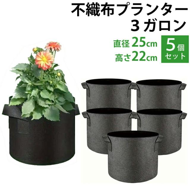 【5個セット】不織布プランター 3ガロン 10.8L ガーデンバッグ 植木鉢 家庭菜園 園芸 鉢 花 野菜 ハーブ 植物 栽培用 通気性 排水性 厚手300g 丈夫 再利用可能 室内 屋外 取っ手付き 移動簡単 コンパクト収納 丸型 軽量 根腐れ対策 エコ素材 多用途 布鉢 栽培ポット 送料無料