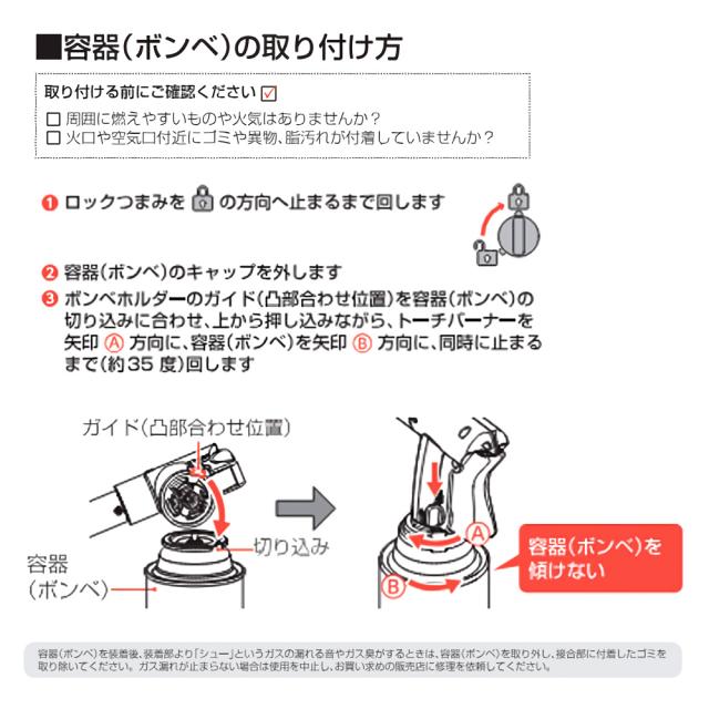 ご注意容器(ボンベ)は必ず「イワタニカセットガス」「イワタニカセットガスパワーゴールド」の表示のある専用容器(ボンベ)を使用してください。他の容器(ボンベ)を使用すると、ガスが漏れたり、着火しないおそれがあります。