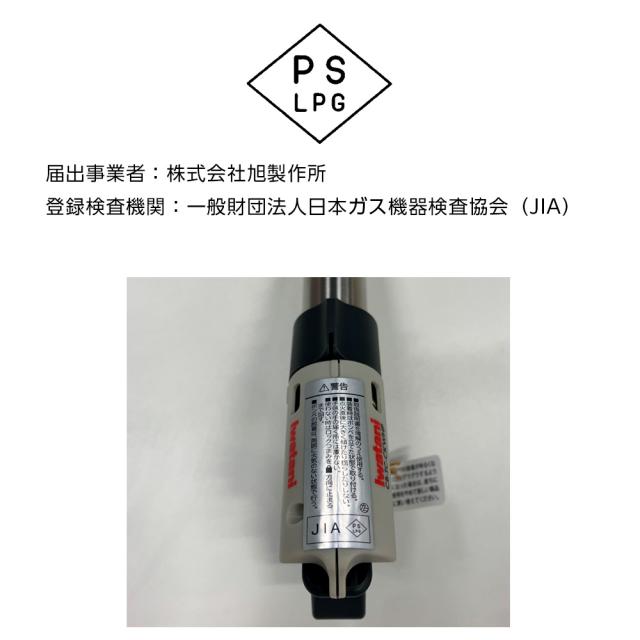 PSマークの種別:種別/PSLPG 届出事業者名/株式会社旭製作所 登録機関名称/日本ガス石油機器検査協会