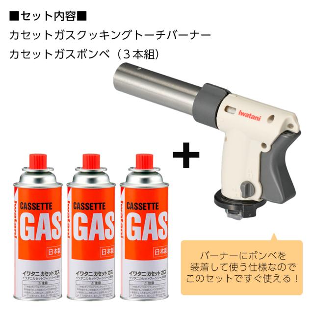 片手で使いやすい調理専用トーチバーナーとカセットボンベ3本組のセット。