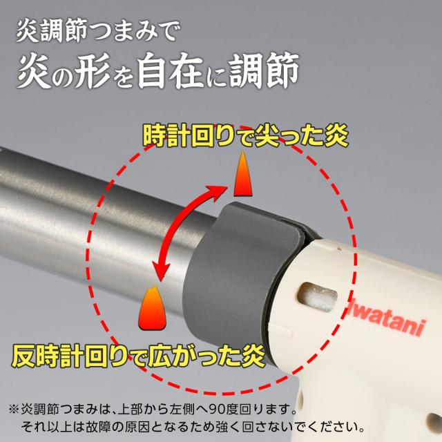 炎の強さ・形・自由自在炎調節つまみを右方向(時計回り)に回すと細くとがった炎に、左方向(反時計回り)に回すとやわらかく広がった炎に調整が可能です。