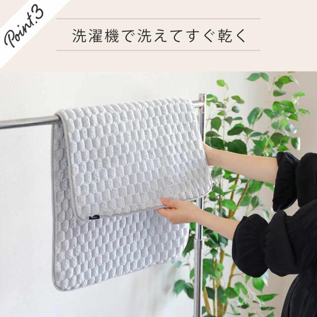 ぽこぽこした感触が足の裏にフィットし、クセになるマイクロファイバータオル素材のバスマットです。ぎっしりと詰まった繊維の表面をカットパイルでやわらかな肌触りに仕上げることにより、優しい踏み心地を実現。お風呂上がりが楽しみになる1枚です。