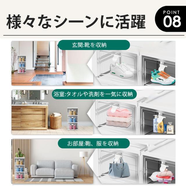 【様々のシーンに活躍】シューズボックスの両側が半透明で正面はクリア生地を採用、高級感が溢れます。完全透明ではないので、どこに置いても混乱というイメージがないです。クローゼットの中に置いて服などを収納したり、浴室に置いて洗剤やタオルなどを収納したり、玄関に置いて鞄、帽子などを収納できます。