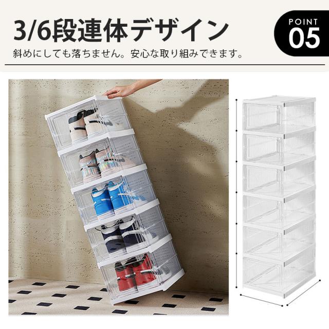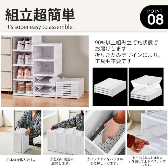 【面倒な組立不要、折りたたみ式】他のシューズボックスと違って、板を一枚一枚組立する必要がないんです。使わない時、収納にもラクラク、引越し時にも持ち運びに便利。