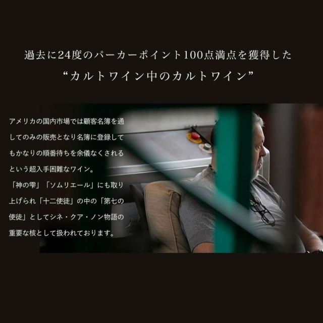 超レア・ワイン!過去に27度のパーカーポイント100点満点獲得した“カルトワイン中のカルトワイン”がついに!年に一度の極少量入荷!これは飲む芸術だとパーカーにいわしめ、神の雫『第七の使徒』の究極のカルトワイン (アメリカの国内市場では顧客名簿を通してのみの販売) !ジェブダナックに『2020年のカリフォルニアのトップワインのひとつであることは間違いない。』と絶賛させ驚異の100点満点獲得!