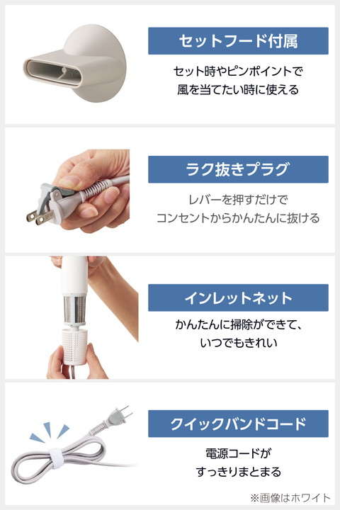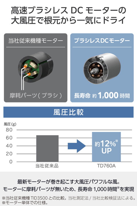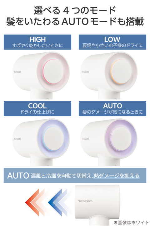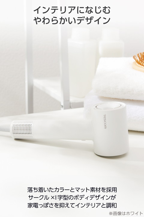 速い・軽い・静か。毎日のヘアドライのストレスからあなたを解放する、テスコム初のI字型ドライヤー。最新モーターが巻き起こすパワフルな風が、髪を根元から一気に乾かします。本体質量は約320g(※)と軽量。さらに、モーターをグリップに内蔵しているので重心バランスが良く、手首の負荷を軽減します。動作音が控えめなので家族が寝ている夜間や小さいお子様がいる家庭でも使いやすいです。 ※電源コードを除いた本体質量![]() ■速い・軽い・静か、毎日のヘアドライのストレスを解放する、新しいドライヤーのかたち。 ■大風圧の高速ブラシレスDCモーター搭載。最新モーターが巻き起こす体感4.1m3/分(自社測定)のパワフルな風が髪をかき分け、根元から一気に乾かします。 ■高速ブラシレスDCモーターは、モーターに摩耗するパーツがないので長寿命1,000時間を実現。長く安心して使えます。 ※モーター単体での仕様 ■ノズルを短くし無駄を省いたI字型のボディで、本体を約320gまで軽量化。モーターをグリップに内蔵したことで重心バランスに優れた形状を実現。ドライヤーを振る際の手首の負荷を軽減します。 ※電源コードを除いた本体質量 ■約59%コンパクト化!スリムなボディだから洗面所などの限られたスペースでも収納に便利です。 ■※当社従来機種TID3500との体積比較。当社測定法/当社比較検証法による ■低騒音化で多様なライフスタイルにフィット。自社従来製品より約7%低騒音化。動作音が控えめなので家族が寝ている夜間や小さいお子様がいる家庭でも使いやすいです。 ■※当社従来機種TID3500との比較。当社測定法/当社比較検証法による ■選べる4つのモード搭載。AUTOモードが熱ダメージを抑制し、髪を優しく乾かす。HIGH/LOW/COOL/AUTOの4つのモードから好みの温度を選べます。温度に合わせて温度LEDリングの色が変化します。 ■インテリアに馴染むやわらかいデザイン。落ち着いたカラーとマット素材を採用。サークル×I字型のボディデザインが家電っぽさを抑え、インテリアと調和します。 ■マイナスイオンが髪の広がりの一因となる静電気を低減。髪のツヤもアップします。 ■ブローしやすいセットフード付属。口が平らになっているからブラシにフィット。 ■ラク抜きプラグで取り外し簡単。レバーを押すだけでコンセントから簡単に抜くことができます。 ■お掃除しやすいインレットネット。着脱が簡単でお掃除がラクだから、いつでもきれいを保てます。 ■電源コードがスッキリまとまるクイックコードバンド付き。 ■※製品の定格・仕様は改良のため、予告なく変更することがありますのでご了承ください。 ![]() ■電源:AC100V 50/60Hz ■消費電力:1200W ■カラー:ベージュ ■主材料:本体:ポリカーボネート、ABS ■コード長:1.7m ■付属品:セットフード ■スイッチ:切替スイッチ TURBO/SET/OFF、MODEスイッチ HIGH/LOW/COOL/AUTO ■風量(m3/分):0.8m3/分(JIS規格)、4.1m3/分(自社基準) ■温風温度:100℃(周囲温度30℃の場合。TURBO-HIGH使用時) ■外形寸法:幅約92mm×奥行約70mm×高さ約239mm(本体のみ)、幅約146mm×奥行約70mm×高さ約239mm(フード付き) ■質量:約450g(本体のみ 電源コード含む)、約495g(フード付き) ■パーツ:セットフード(TA033000) ■保証期間:1年間 |