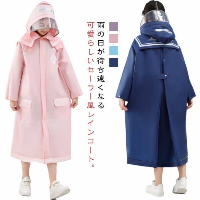 完全防水 レインコート キッズ ランドセル対応 かわいい セーラー襟 女の子 小学生子供用 リュック バックパック 対応 撥水 カッパ 合羽 雨具 膝下 ロング レインウェア 送料無料