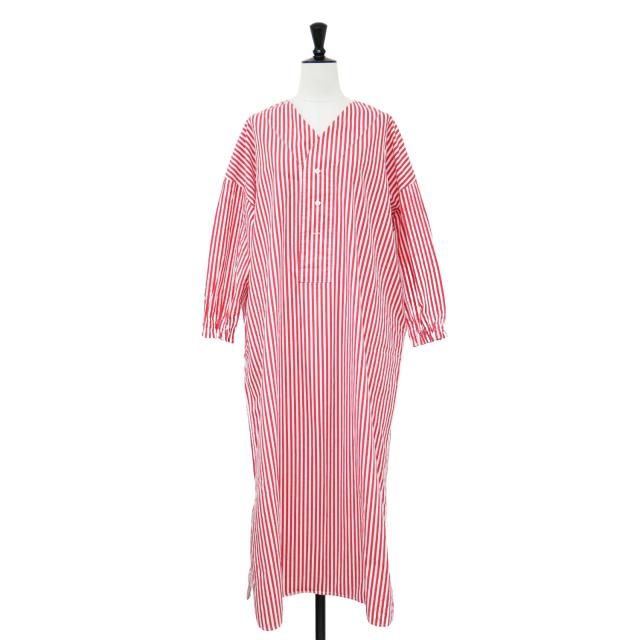 kiino. キイノ ワンピース レッド ホワイト サイズ:FREE / ストライプ柄 Vネック シャツワンピース / ロング丈 長袖 コットン / トップス ドレス【レディース】【中古】【K4464】