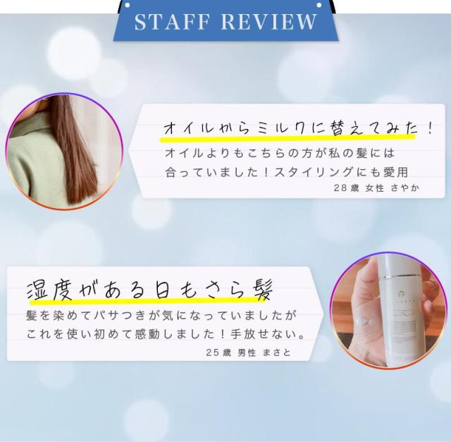 タオルドライした後にアウトバストリートメントを 手のひらでよくのばし、毛先中心になじませた後、乾かしてください。