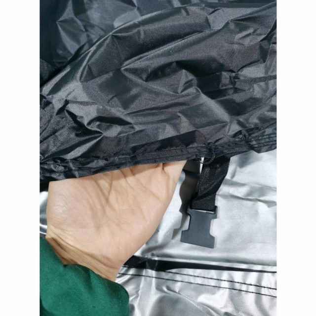 バイクカバーの底部はバックルで設計されており、風が吹いてもしっかりと固定されます。大きめのロックホールがカバーの上部に配置されており、バイクとカバーをしっかりと施錠できるため、盗難防止にも役立ちます。