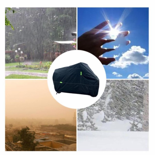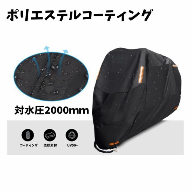 シームテープ付きで、裏面にはポリウレタン塗料を施しているため、高い撥水効果とUVカット効果を発揮します。風の侵入を防ぎ、雨や雪、ほこり、ゴミ、摩擦などからバイクを保護します。ワイヤーロックリング穴が付いており、盗難からバイクをしっかりと保護し、バックルと絞りゴムにより風飛びを防ぎます。