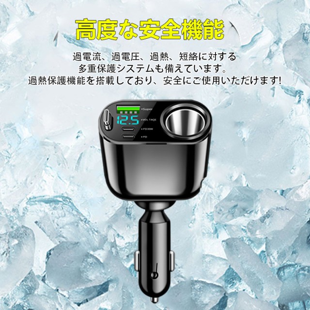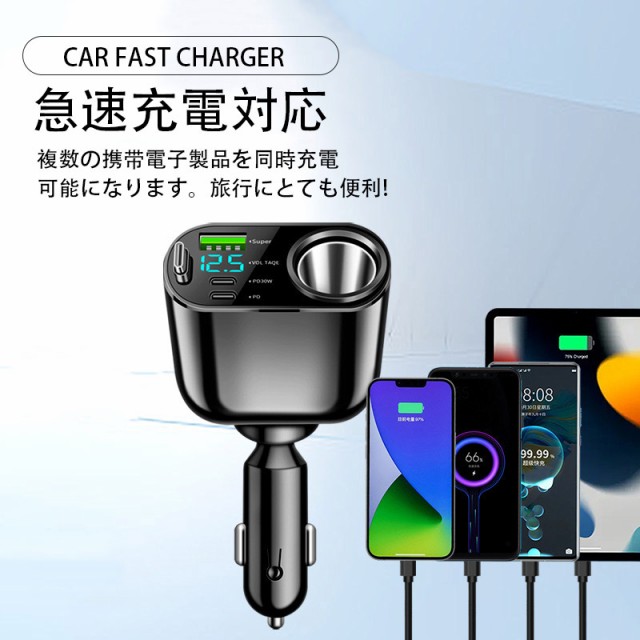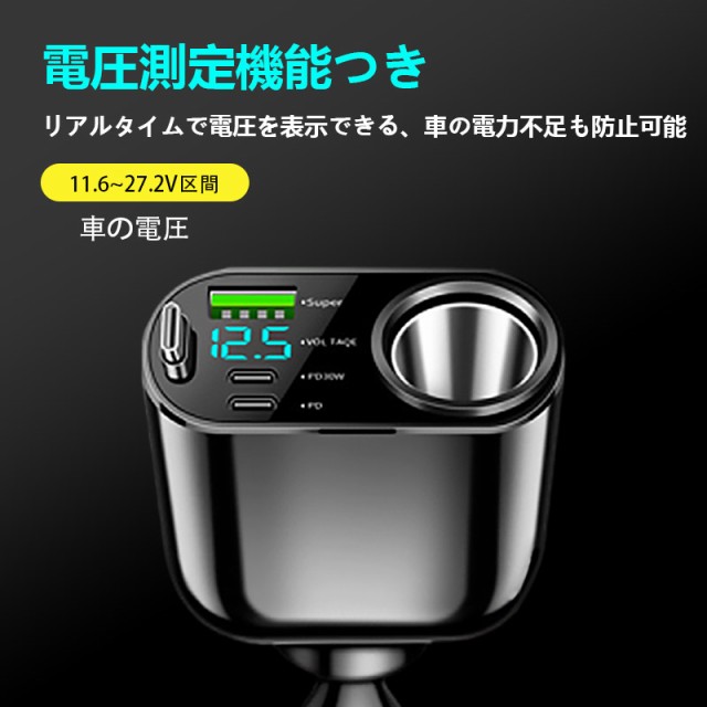 新発売、QC3.0急速充電対応、USB1ポート、PD2ポート、電圧表示機能と伸縮ケーブル付きの車用シガーソケットです。