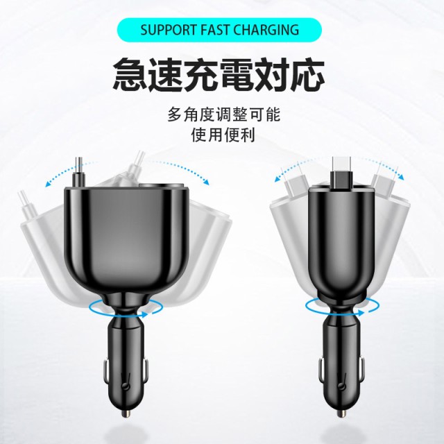シガーソケット USB 増設 伸縮ケーブル 車載充電器 QC3.0 カーチャージャー 電圧計付き 12V 24V 車用 急速 5in1 急速充電器