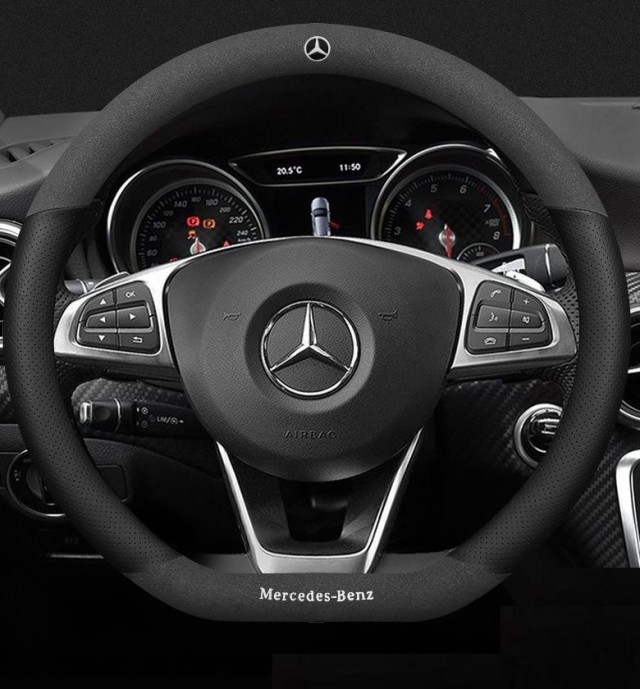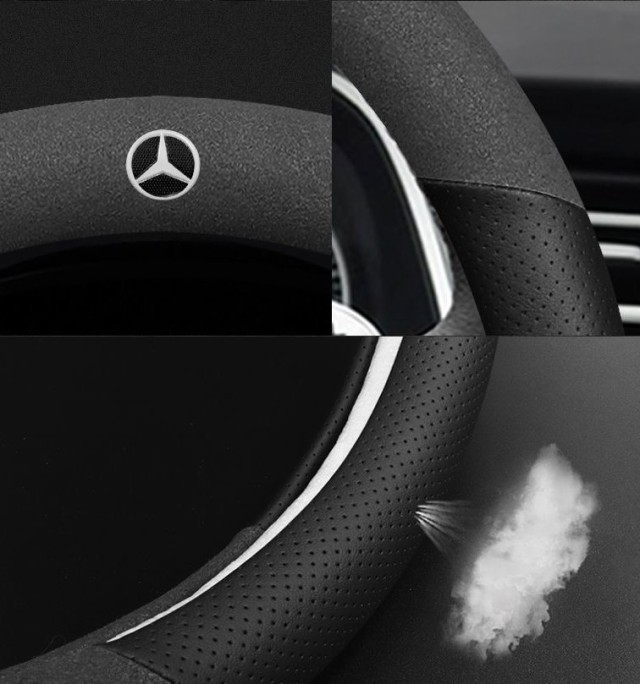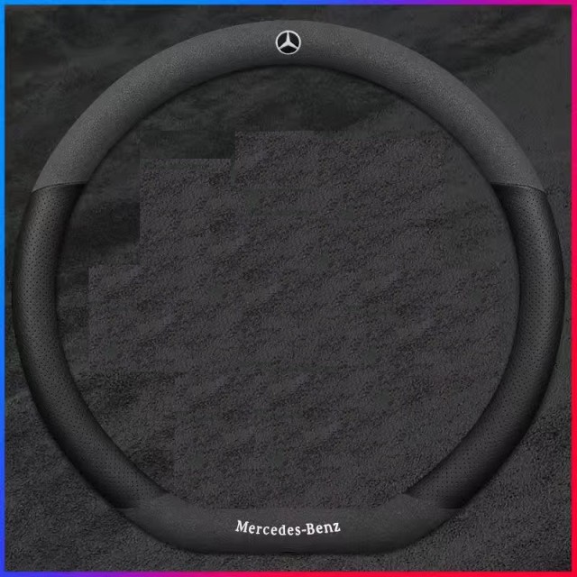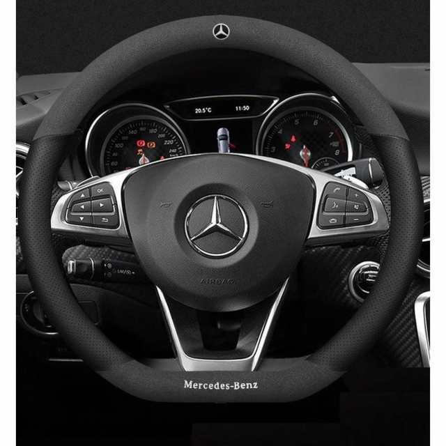 ◆メルセデス・ベンツ◆ハンドルカバー ステアリングカバー ハンドル保護 コンパス 滑り止め 専車ロゴ 38CM D型◆ブラック アルカンターラ調+レザー◆aaec qtm