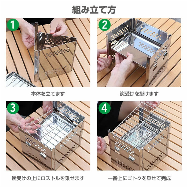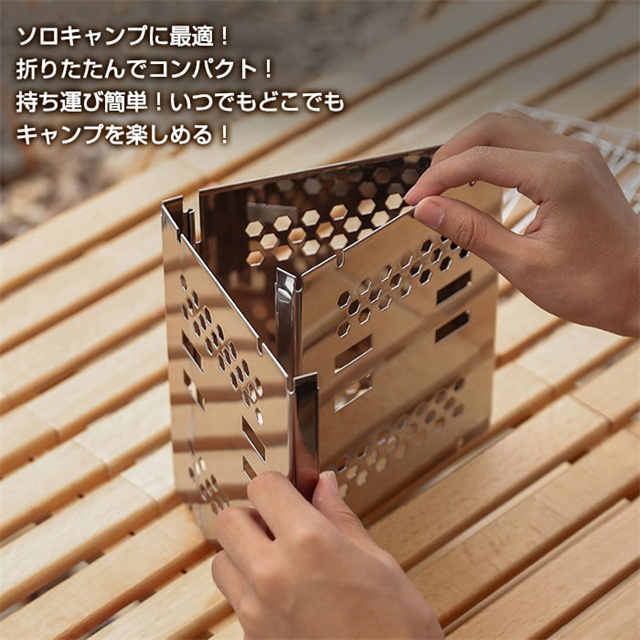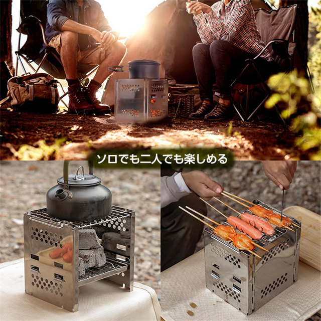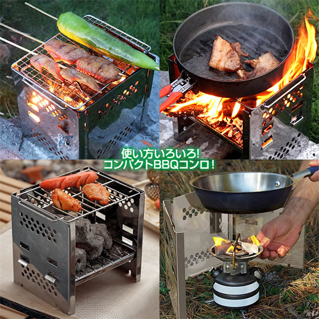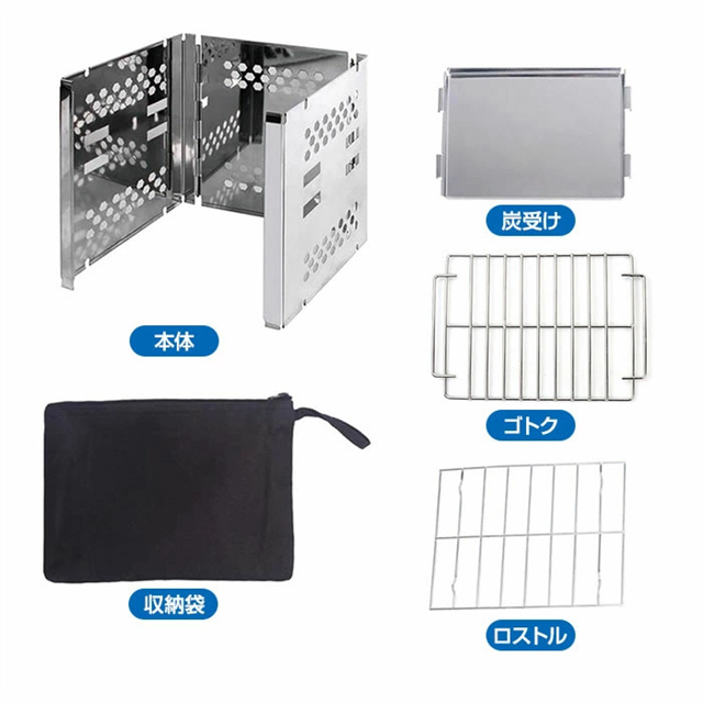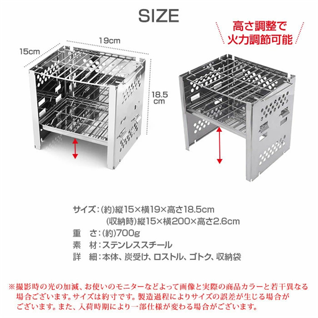 ◆素材 ステンレススチール ◆サイズ (約)縦15×横19×高さ18.5cm (収納時)縦15×横200×高さ2.6cm 重さ:(約)700g ◆その他詳細 本体、炭受け、ロストル、ゴトク ◆付属品 収納袋 |