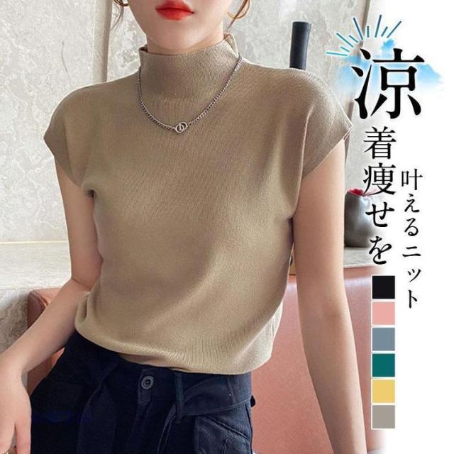 サマーニット レディース 半袖 春 夏 接触冷感 トップス セーター ハイネック 涼しい 冷房対策 オフィス 薄手 プルオーバー 伸縮性 体型カバー
