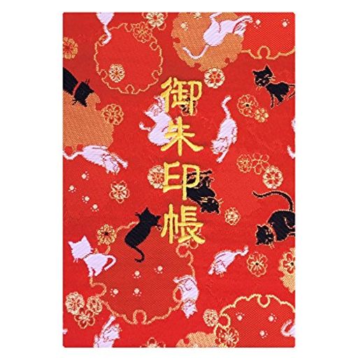 千糸繍院 御朱印帳M【紅雪輪猫】西陣織 金襴装丁/刺繍文字 蛇腹式48ページ 中判(金色刺繍文字/白色本文)