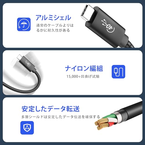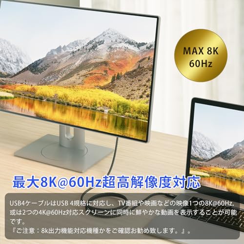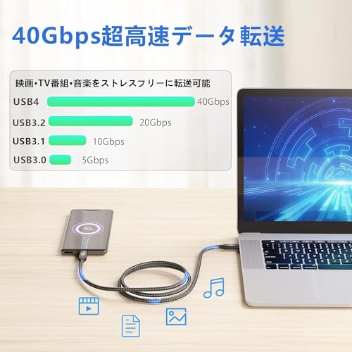 【40Gbps高速データ転送】USB-IF認証取得のUSB 4ケーブルは、Thunderbolt 3をもとに革新されたもので、Thunderbolt 4、Thunderbolt 3、USB 3.2 /3.1 / 3.0 / 2.0と完全な互換性を備えています。現在、最も万能なUSBプロトコルとなります。USB 4.0 規格に対応し、最大40Gbpsのデータ転送速度に達し、映画や写真やファイルなどの転送は一瞬完成可能で、時間を大幅に節約できます。