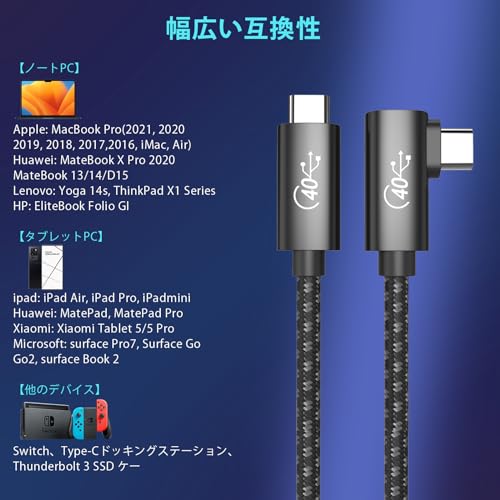USB4 ケーブル L字 2m thunderbolt 4 40Gbps高速転送 / 100w急速充電 / 8K@60Hz映像出力 Thunderbolt 3 とUSB Cと下位互換 サンダーボルト4 ケーブル スマートフォン タブレット パソコン ゲーム機などのUSB Cポートを搭載したデバイスに (2m L字 ブラック)