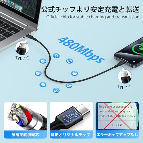 【20W急速充電】 USB-CからUSB-C急速充電ケーブルはPD 3.0急速充電に対応しており、新しいiPhone 15/15 Plus/15 Pro/15 Pro MaxやMacbookをオリジナルの充電ケーブルと同等の速度で充電します。急速充電により、デバイスを35分で最大70%まで充電することが可能であり、またデータ転送速度は最大480Mbpsを実現します。(注:このUSB-C充電ケーブルはビデオ出力機能には対応していません。)