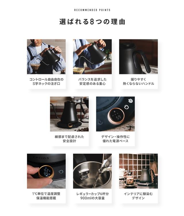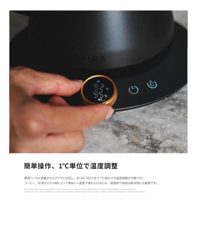 エペイオス EPEIOS ケトル 電気ケトル ドリップケトル コーヒーケトル コーヒーポット 電気ポット やかん おしゃれ 0.9L 1200W コーヒーケトル コーヒーポット 1℃単位温度調節 保温 急速沸騰 細口 注ぎやすい ステンレス