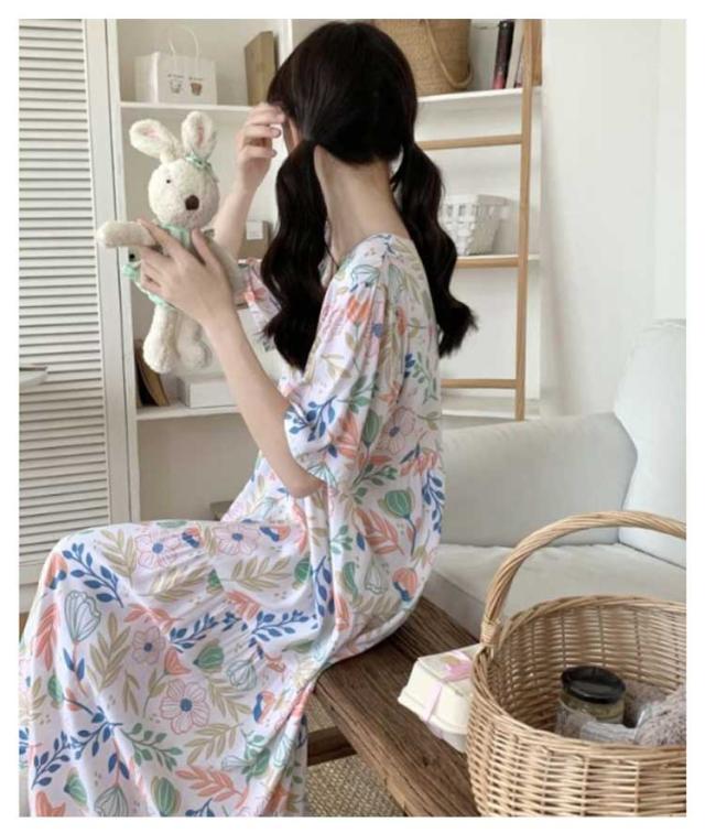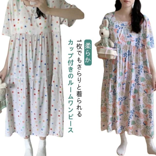 夏 ルームワンピース 部屋着 パジャマ 半袖 レディース ルームウェア コットン 可愛い ワンピース ロング 5分袖 カップ付き ゆったり 涼しい 寝間着 リラックス 五分袖 大きいサイズ カジュアル 柔らか ホームウェア 寝間着