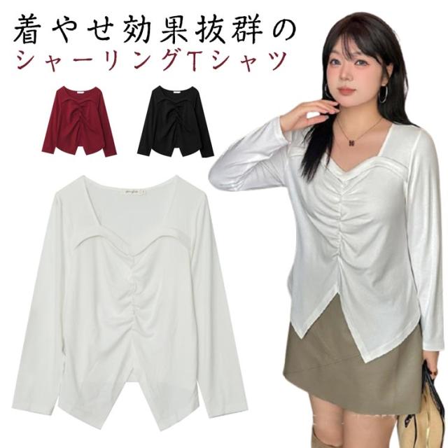 ぽっちゃりさん Tシャツ シャーリングロンt シャーリングロンt レディース インナー 大きいサイズ 体型カバー スクエアネック 長袖 肌着 トップス 薄手 着痩せ プルオーバー トップス 秋服 春秋