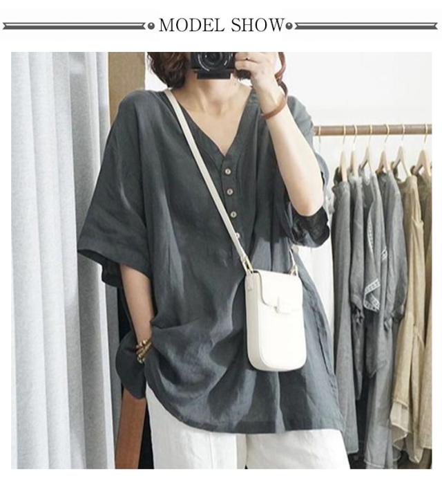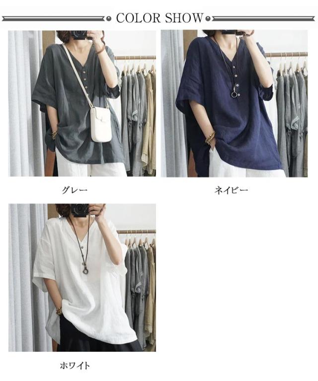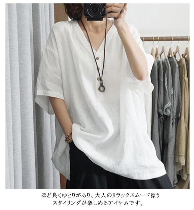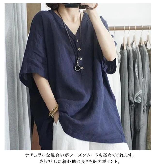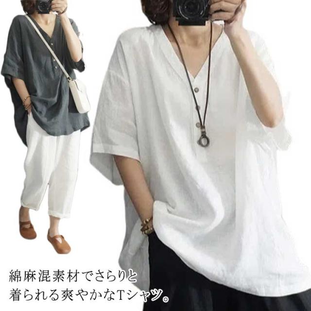 tシャツ ブラウス Vネック リネン混 レディース 綿麻 トップス 前開き 麻混 涼しい ナチュラル tシャツ 薄手 ゆったり 体型カバー 大きいサイズ おしゃれ シンプル 可愛い 通勤 きれいめ カジュアル オフィス