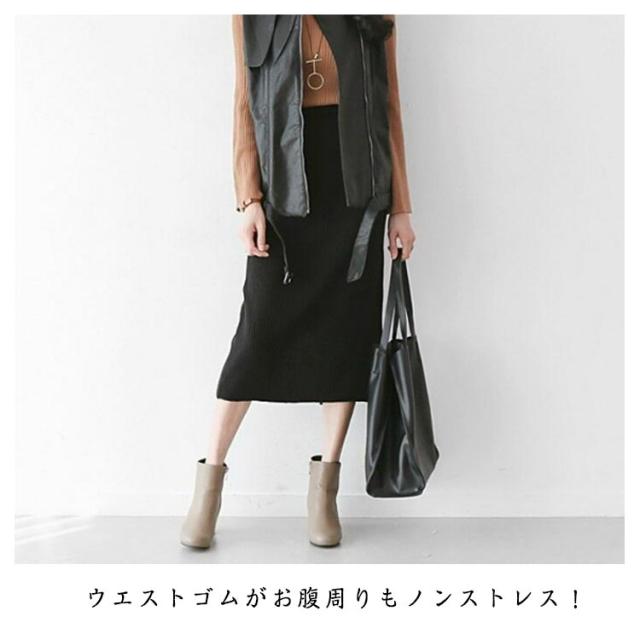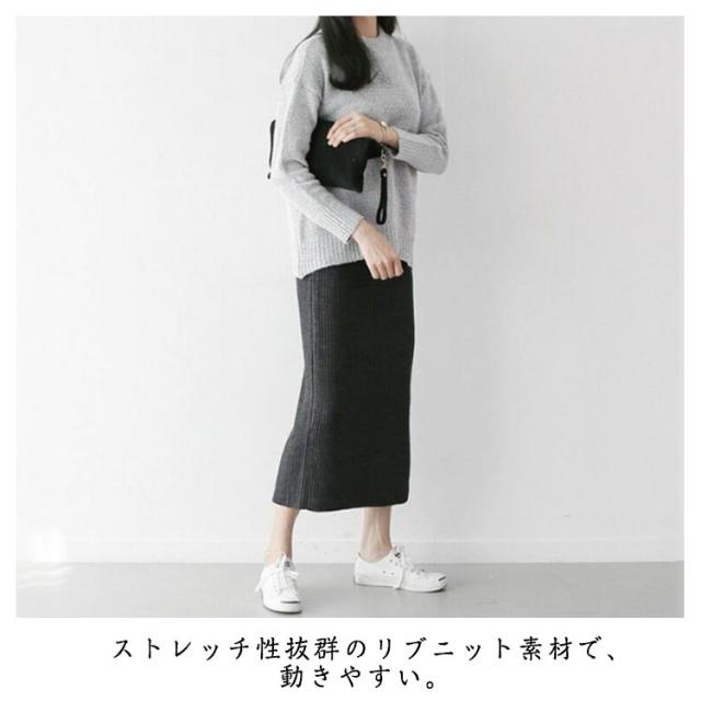 | カジュアルにもきれいめにも使えるニットスカート。 程よくタイトな女性らしいシルエット。 ストレッチ性抜群のリブニット素材で、動きやすい。 スリット入りで、後ろ姿も大人っぽくセクシーな印象に。 ウエストゴムがお腹周りもノンストレス! 流行に左右されないシンプルなデザインで、長く愛用出来ます | |