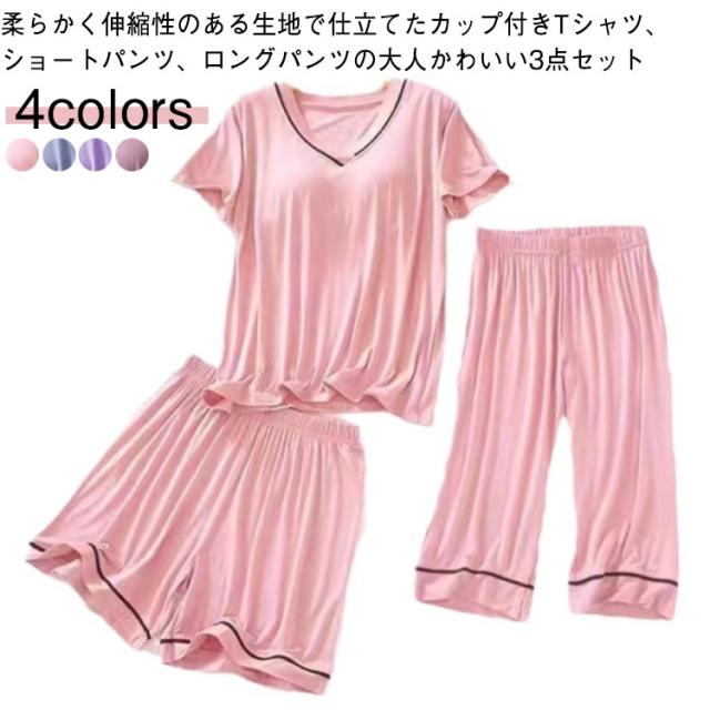 寝間着 3点セット ルームウェア レディース 夏 パジャマ 夏用 パンツ Tシャツ 半袖 ショートパンツ 7分丈パンツ ルームウェア 上下セット ナイトウェア 部屋着 セットアップ 短パン カットソー パッド付き 薄手 柔らか