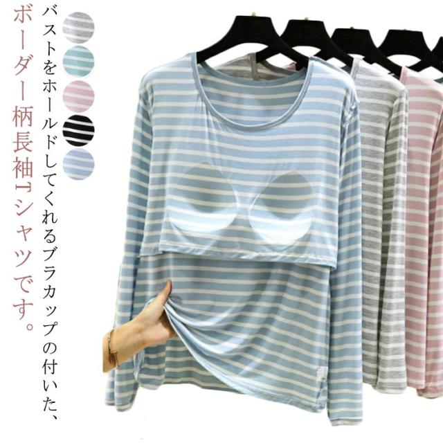 下着 ボーダー ブラトップ カップ付き 長袖 女性用 伸縮性 ロンT レディース パット付長袖Tシャツ カットソー トップス 無地 パット付長袖Tシャツ ルームウェア 肌着 Tシャツ パッド付き 速乾 ストレッチ 締め付けない 通気性 送料無料 インナー