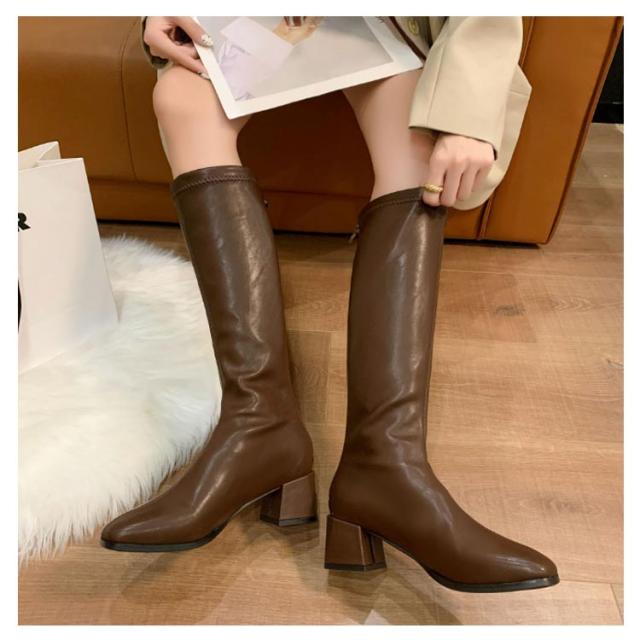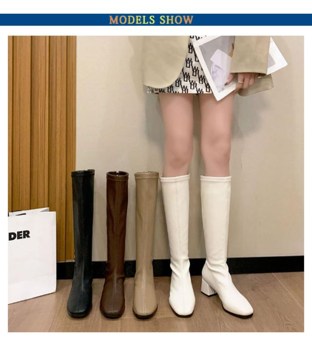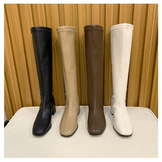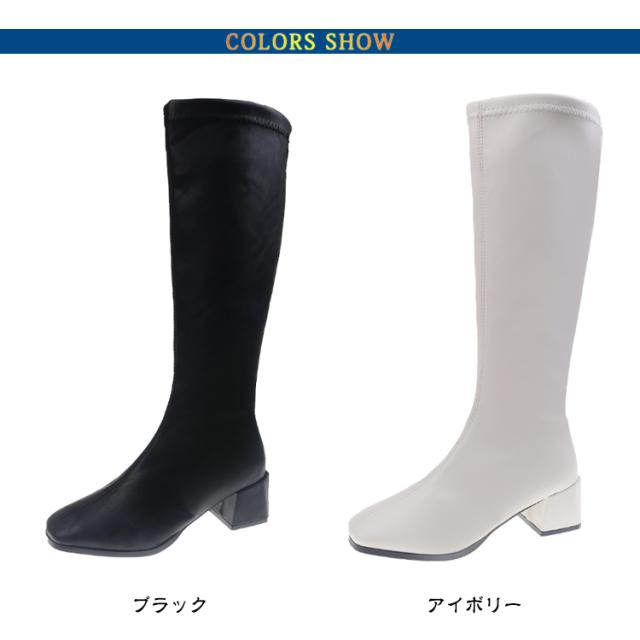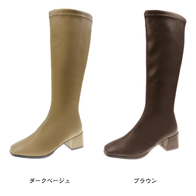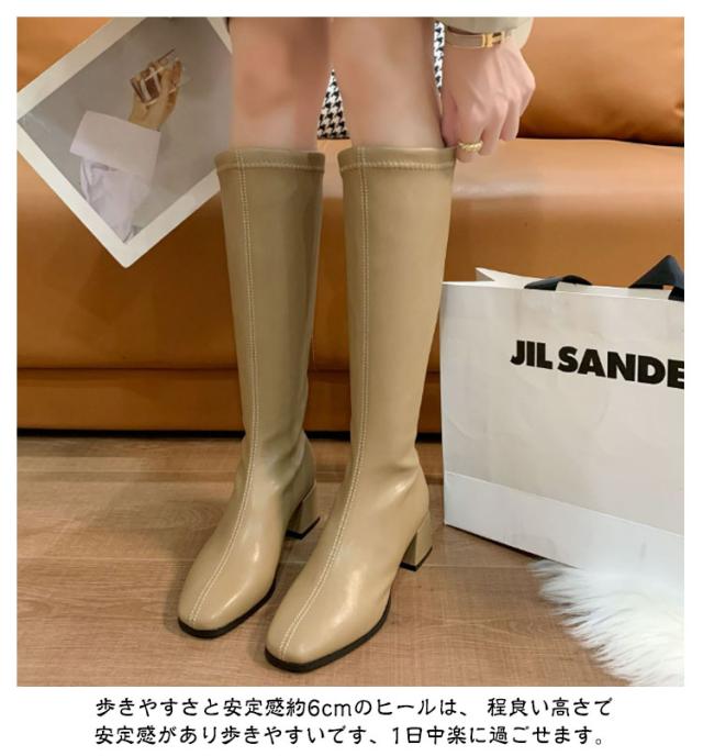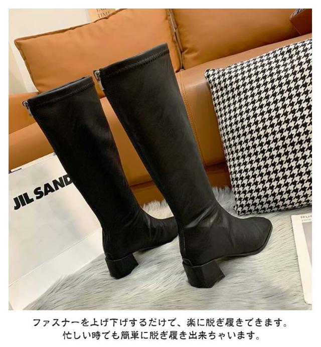スクエアトゥ レディース 痛くない ロングブーツ ブーツ チャンキーヒール 6cm PU ジョッキーブーツ 秋冬 歩きやすい 美脚 シンプル 靴 ブーツ フェイクレザーブーツ 冬靴 エンジニアブーツ 膝丈 黒 ブラック カジュアル