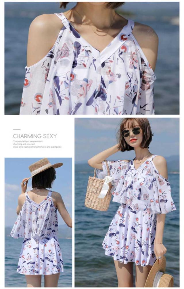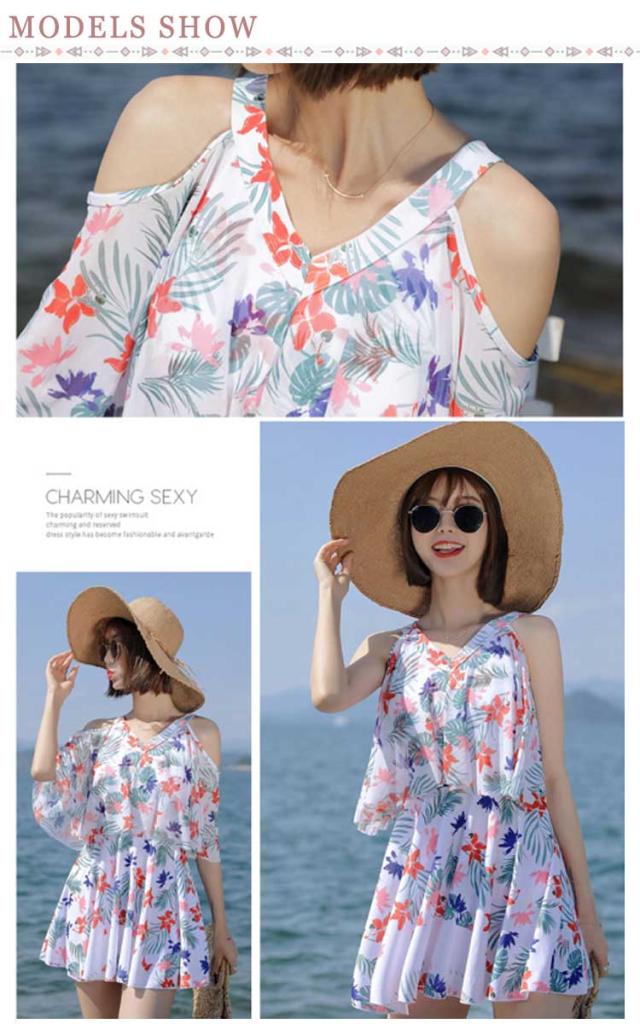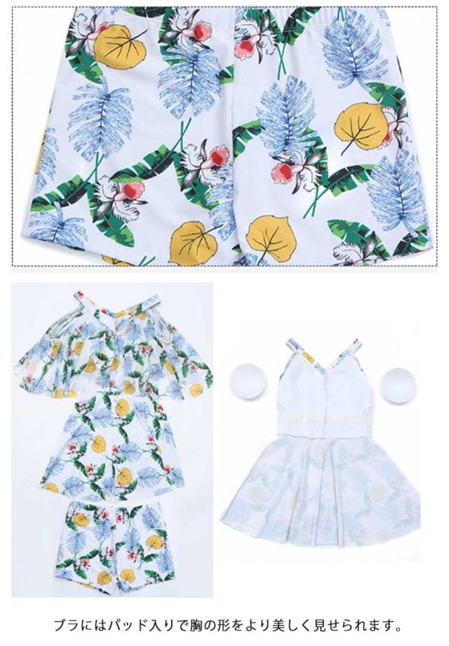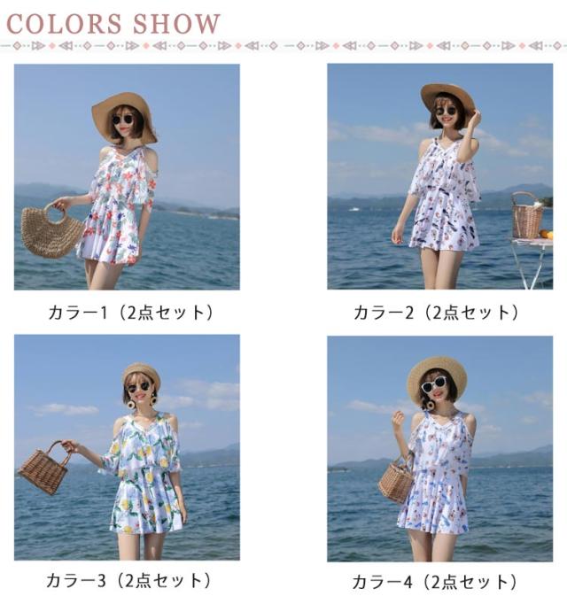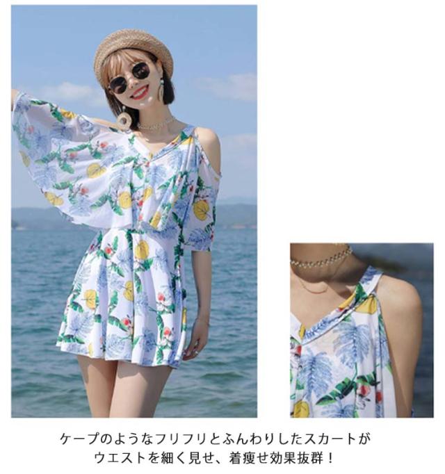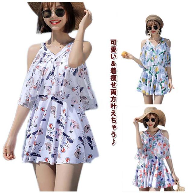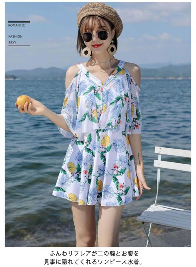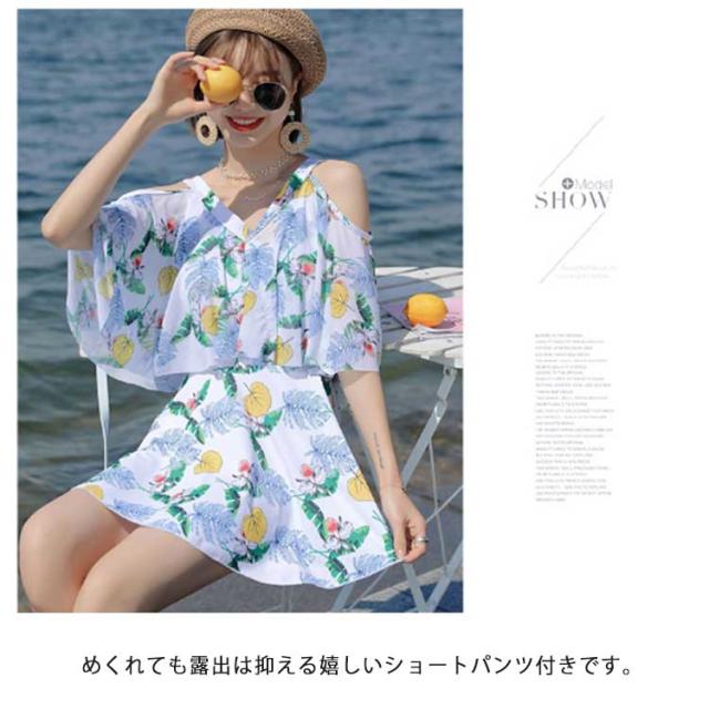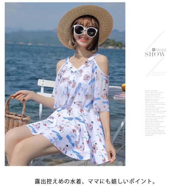 ママ水着 ワンピース水着 レディース オフショルダー 30代 ワンピース水着 体型カバー水着 みずぎ ぽっちゃり 二の腕 総柄 露出控えめ ワンピース 大きいサイズ オトナ女子 20代 カバー 40代 水陸両用 ショートパンツ付き パッド付き