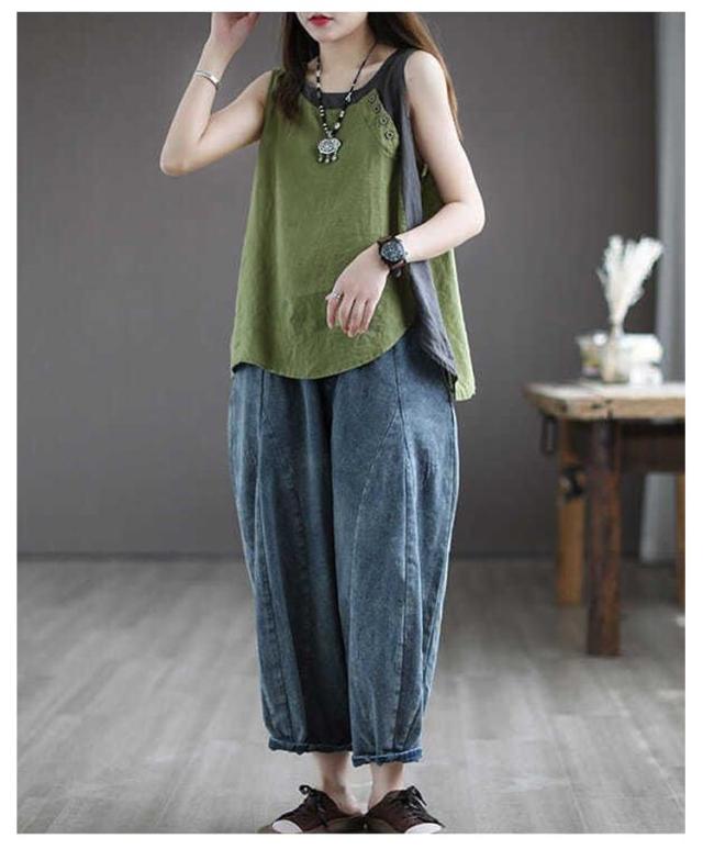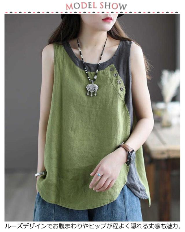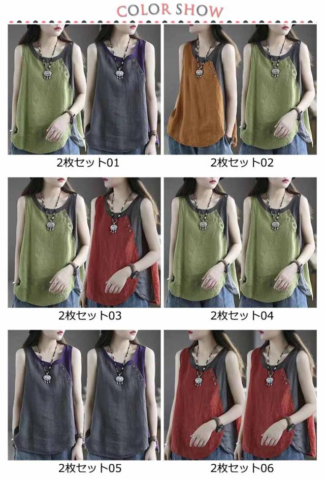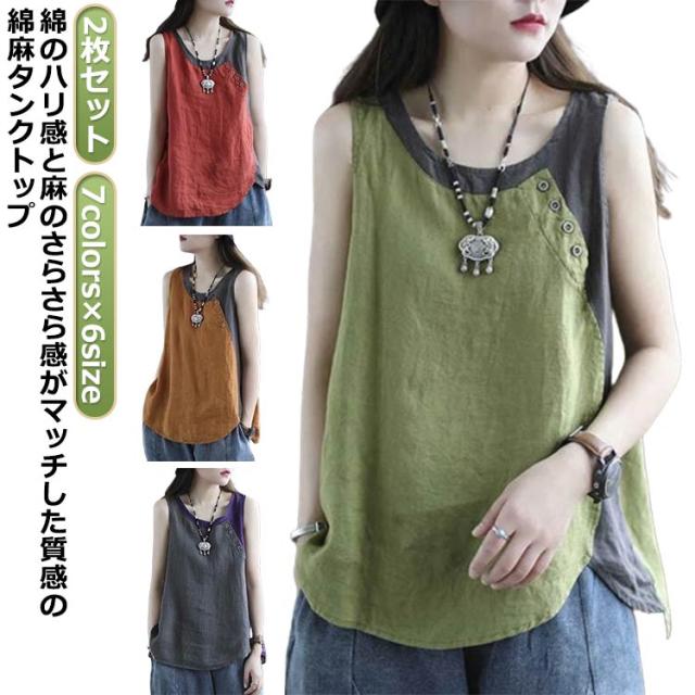 2枚セット ブラウス 2枚セット オーバーサイズ 切り替え 綿麻トップス 薄手 タンクトップ レディース 綿麻 レディース 配色 サマータンク ボタン付き タンクトップ タンクトップ タンク インナー ノースリーブ tシャツ 肌着 下着