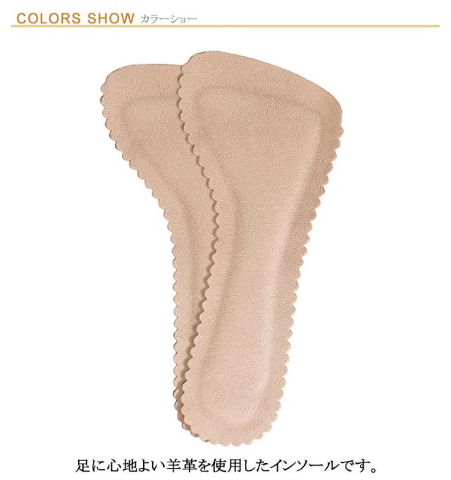 | 2足入り!柔らかい手触り羊革 足に心地よい羊革を使用したインソールです。 表面の羊革が汗を吸収します。 裏側の活性炭が配合されたラテックスフォームは脱臭効果に優れ、クッション効果を与えます。 | |