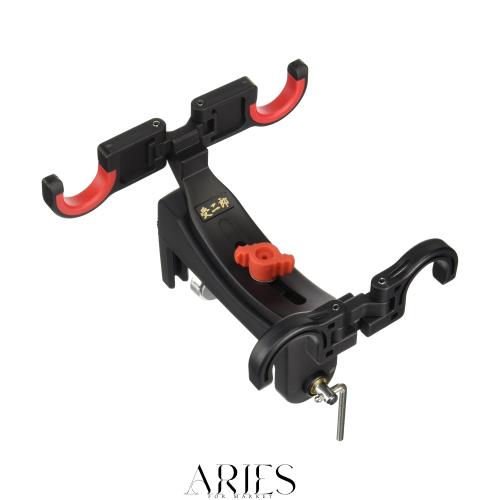 2本竿掛けタイプの手軽な竿受。2本の竿を扇状に角度をつけてセットできますので、オマツリなどの仕掛け絡みのトラブルが防げます。 タテヨコ取付、首振り、竿受角度調節も自由自在。 竿受部分は、折りたためるので携帯に便利です。 クランプネジのL型ハンドルに取り付け、クランプネジを指先でクルクル回せるので船べりへの脱着がスピーディーになります。