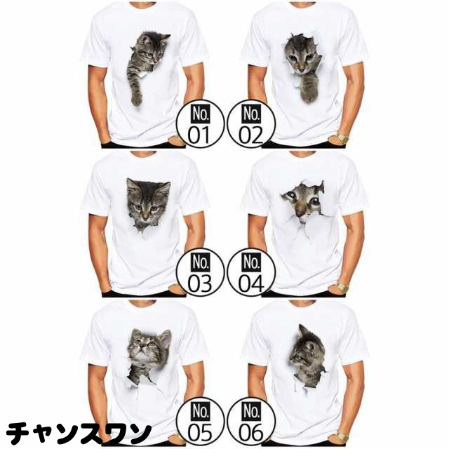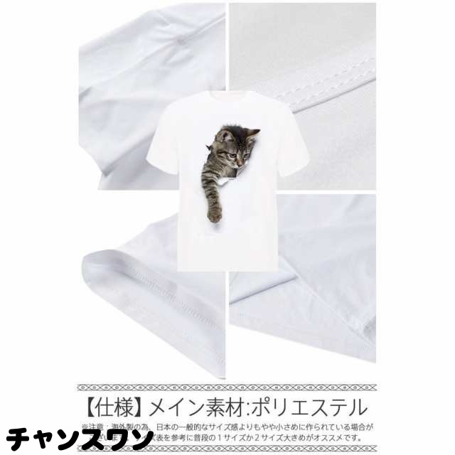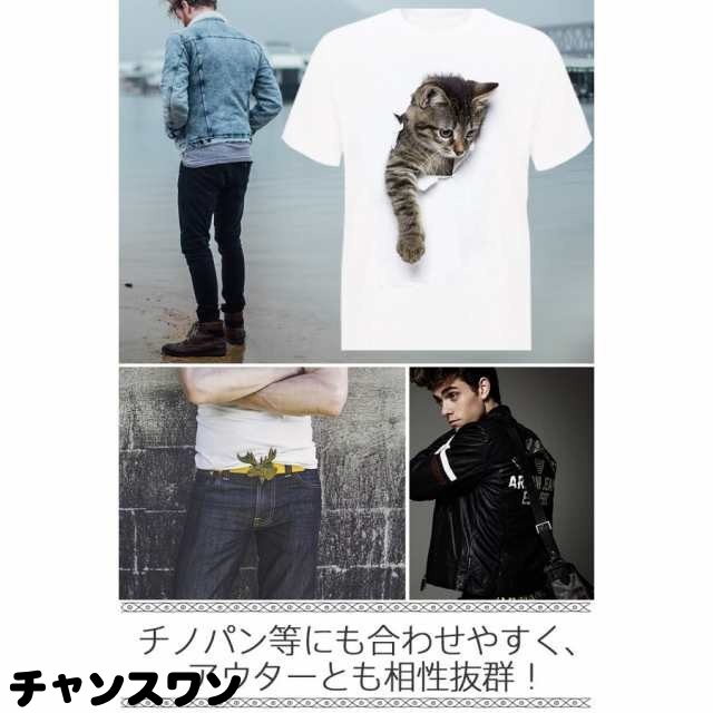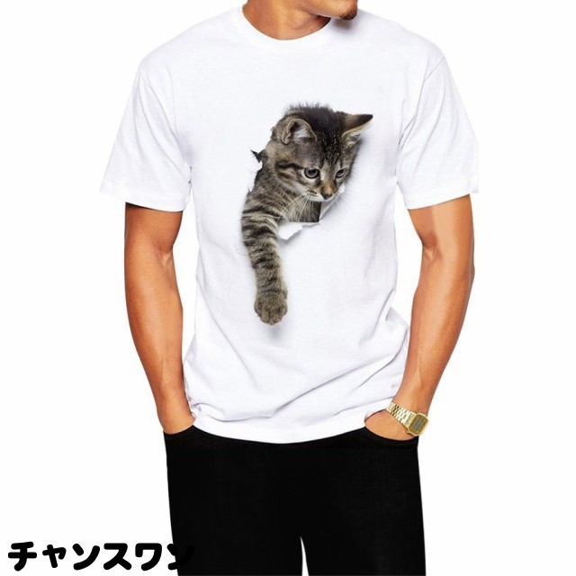 メンズTシャツ 猫 Tシャツ メンズ 白 おもしろ 服 かわいい ネコ柄 トリックアート 風 半袖 シャツ