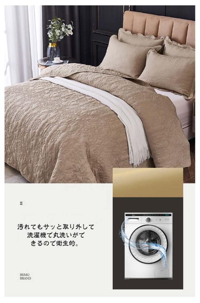 | 上品で優しい。キルティングベッドカバー 肌触りも非常に良くて、一年中お使いいただけます。 エレガントでモダンな雰囲気の中に柔らかさ、優しさをプラス。 寝室がいつも以上にリラックスできる空間になりそう。 ベッドスプレッドやこたつカバー、ソファカバーなど、一年中活躍できるマルチカバーです。 糸を使わない超音波キルト加工を施していますので、糸切れの心配がありません。 汚れてもサッと取り外して洗濯機で丸洗いができるので衛生的。 | |