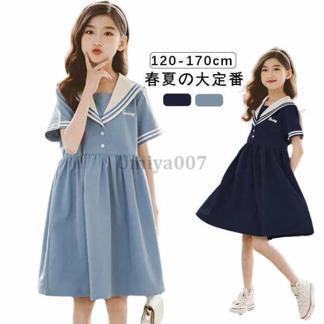 ワンピース女の子女児セーラー服海軍風ドレスセーラーワンピースキッズガールズ子供服半袖襟付き制服夏物ジュニア親子ペア薄手