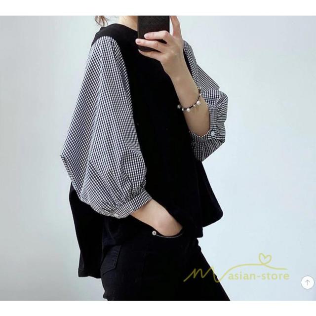 tシャツ レディース 切り替え シャツ ブラウス 無地 チェック柄 黒 グレー 白 パフスリーブ 七分袖 長袖 トップス春物 夏物 秋物 丸首 20代30代40代50代