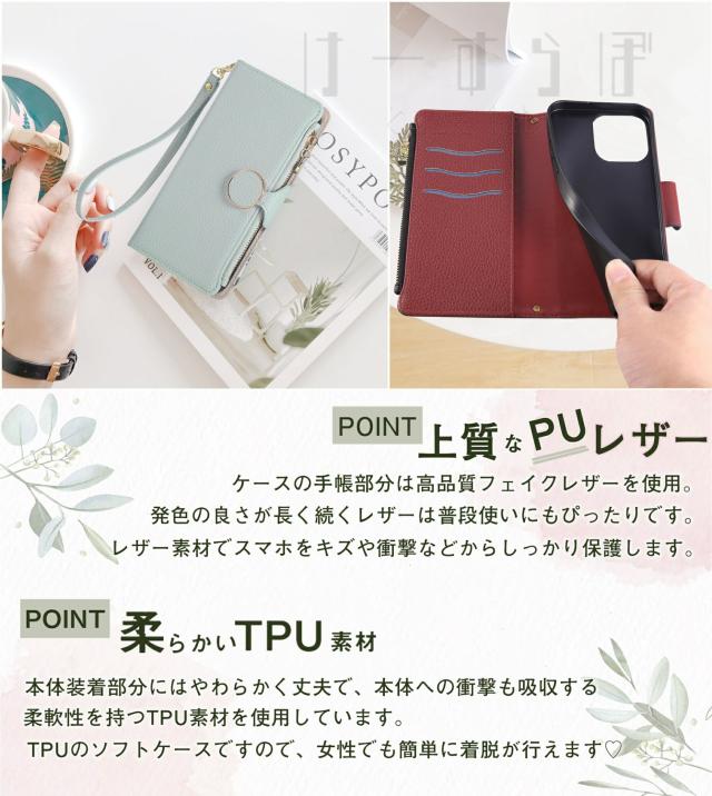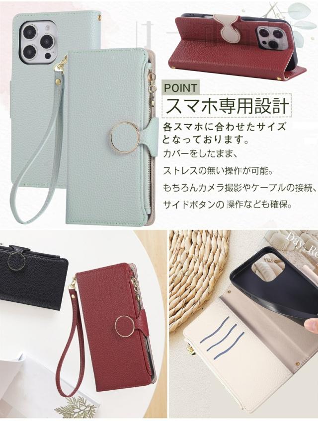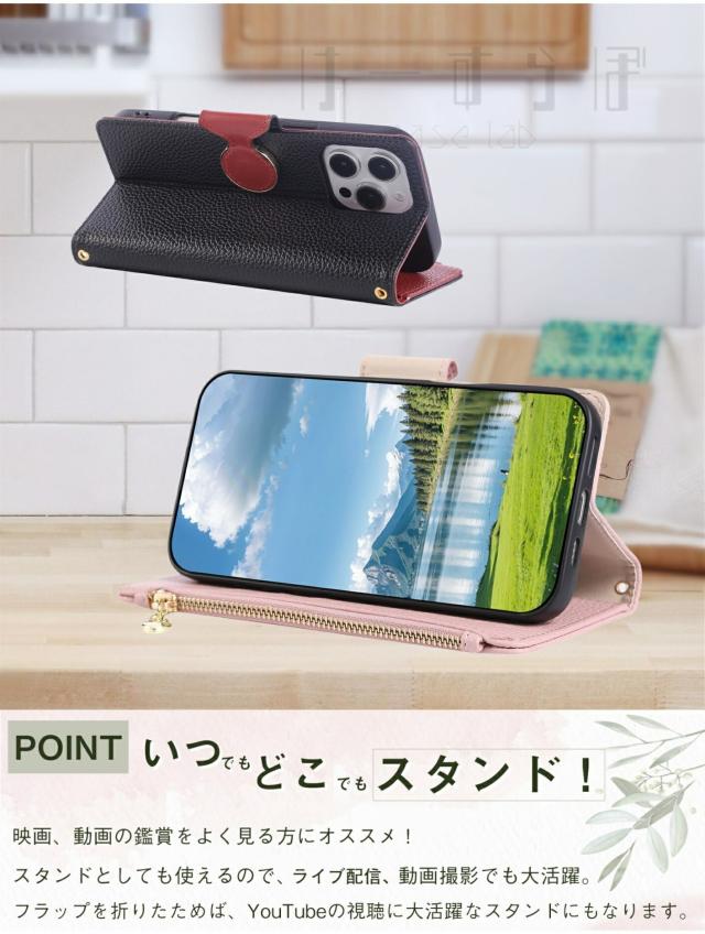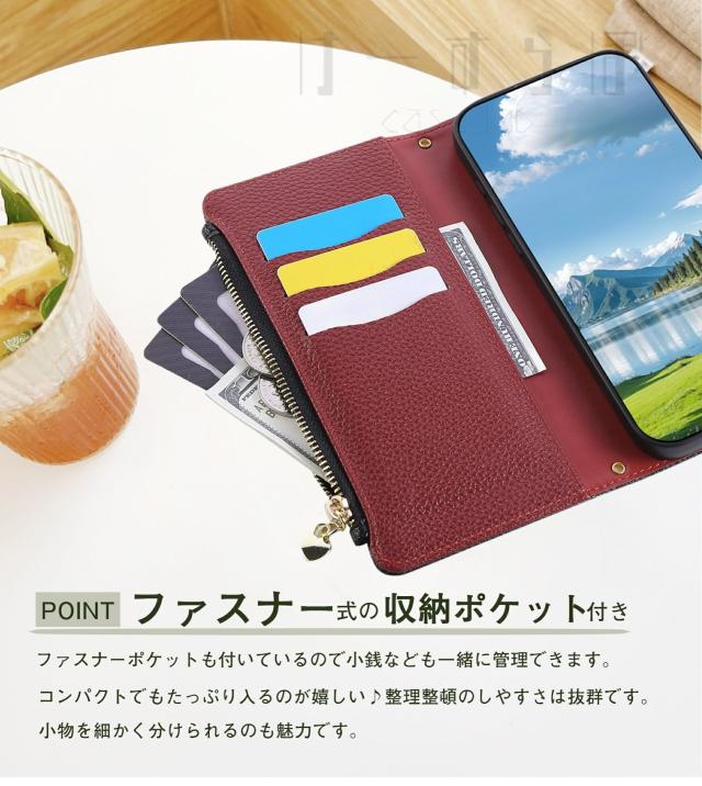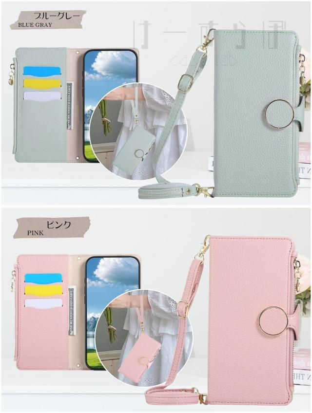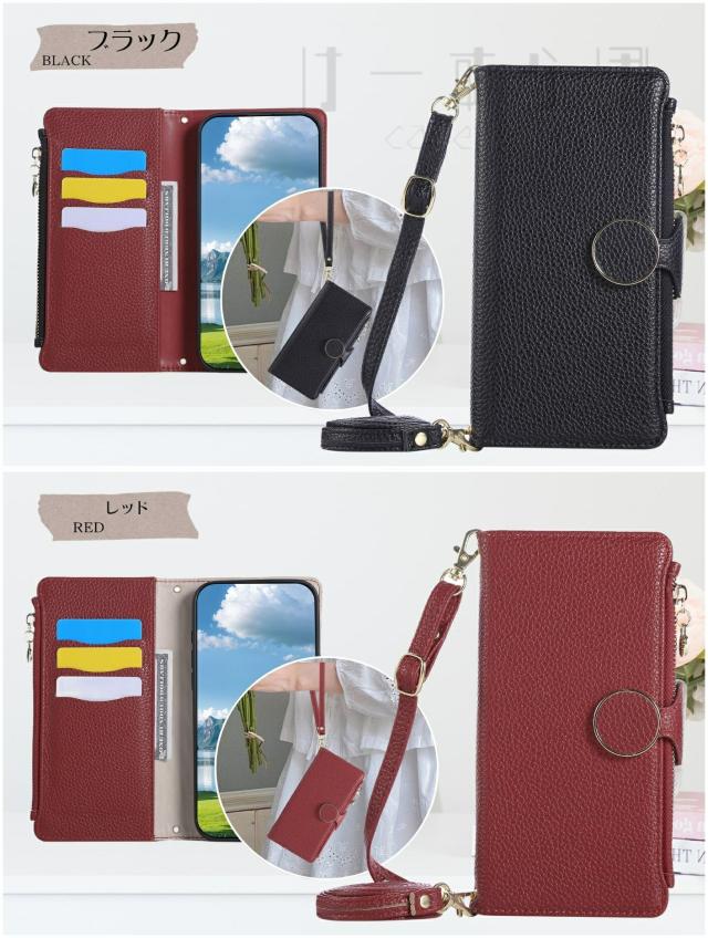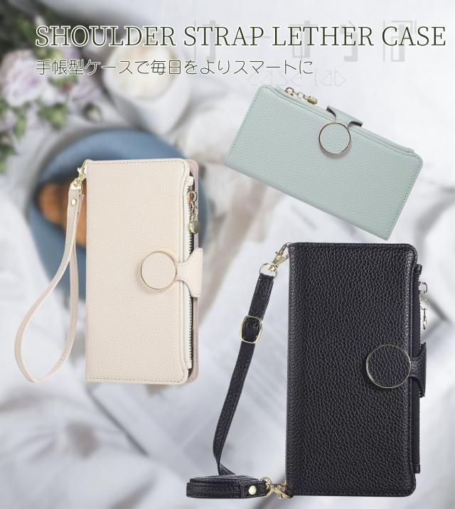 ファスナー式小銭入れ・チェーン型のショルダーストラップ付きの手帳型ケースです。
