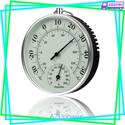 この温度計と湿度計は電池なしで使用でき、大きな文字盤は温度(上)、小さな文字盤は湿度(下)を示します。
