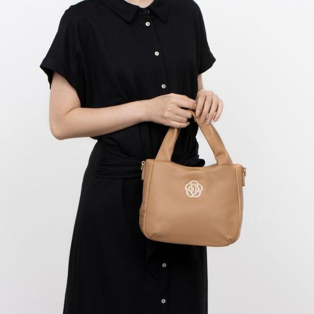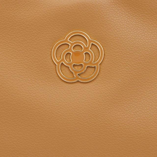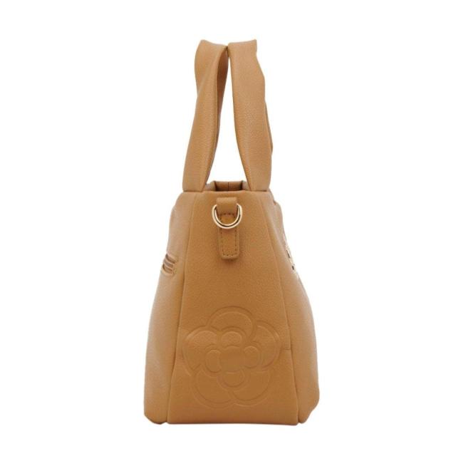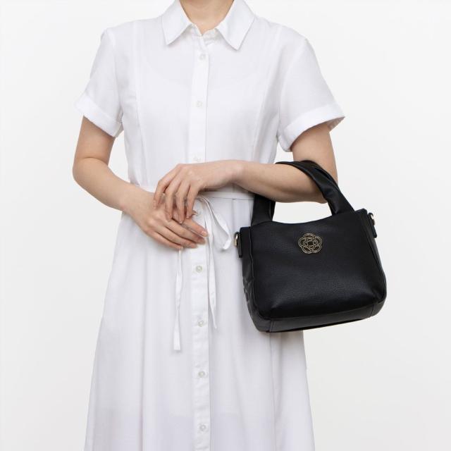 ふっくらとしたソフトな手触りが魅力のバッグに、高級感あふれるカメリアの金具を付けました。